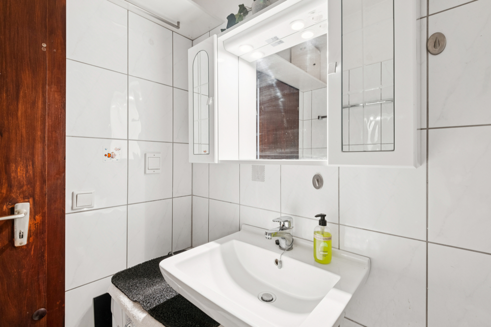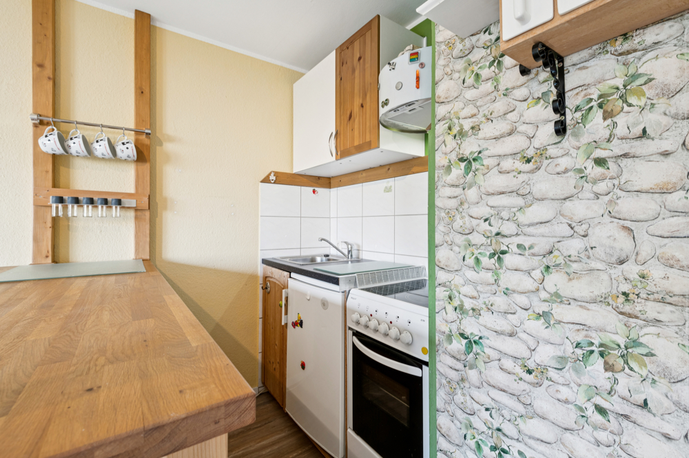 Laminatboden, weiße doppeltisolierverglaste Kunststofffenster, weiße Einbauküche mit Kühl-/Gefrierkombination, Waschmaschine, Badezimmer mit Duschwanne, neuer Heizkörper in 2025. Kellerraum.