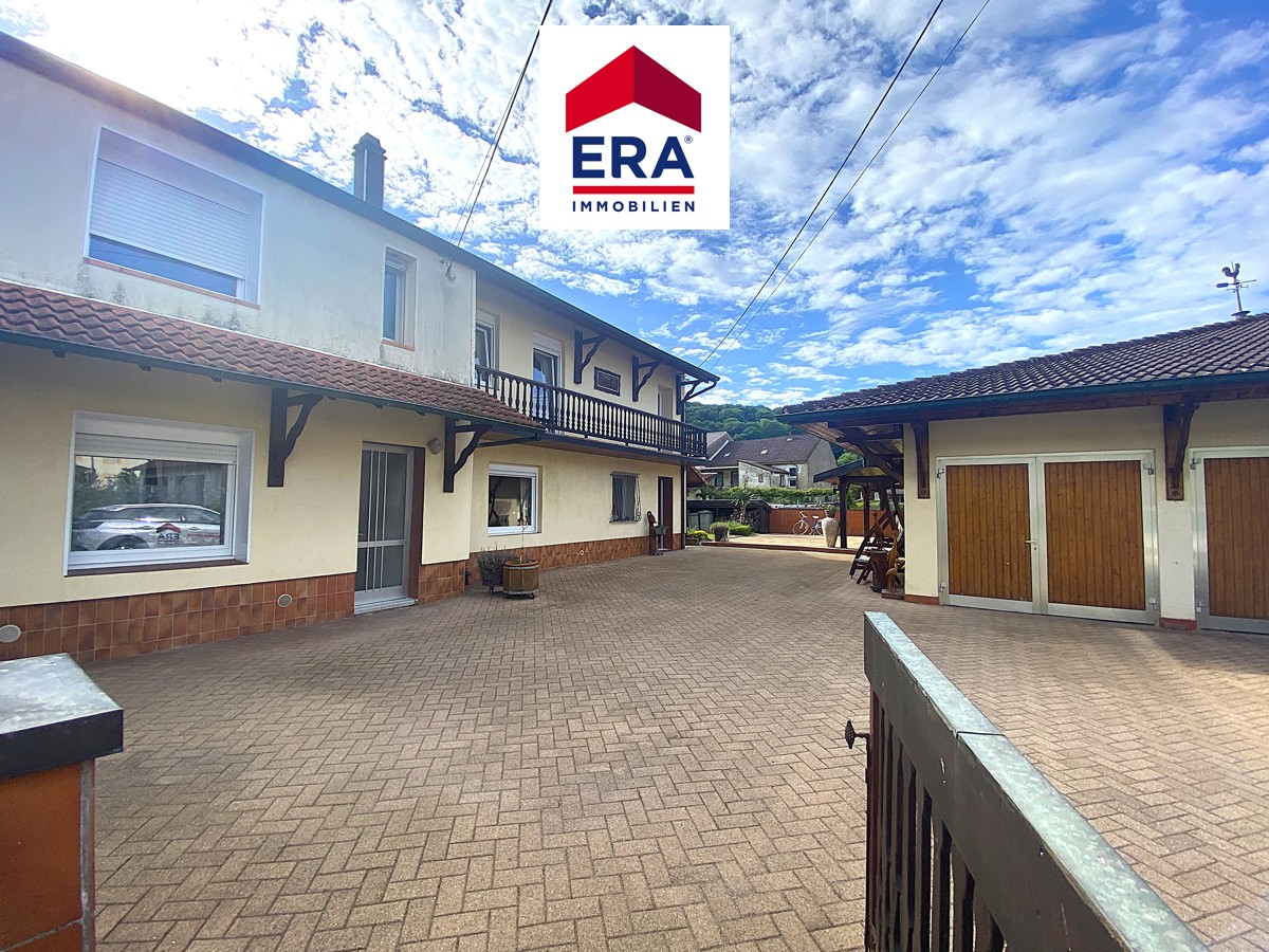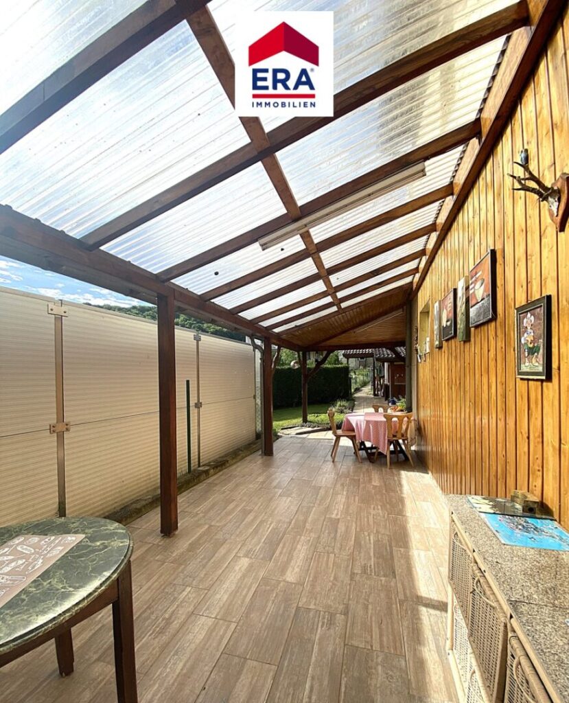 Das separate Gebäude nebenan beinhaltet eine Doppelgarage, eine große Werkstatt und einen Abstellraum, die weitere überdachte Terrasse davor kann zur gemütlichen Sitzecke umgestaltet werden.