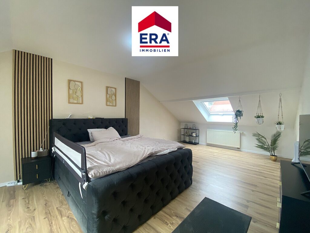 Im OG finden Sie ein großes, lichtdurchflutetes Schlafzimmer mit beidseitigen Dachschrägen, ein Badezimmer mit Dusch-Wanne, Doppelwaschbecken und WC sowie 2 weitere Schlafzimmer.