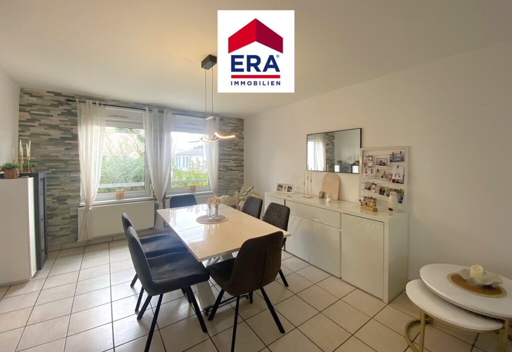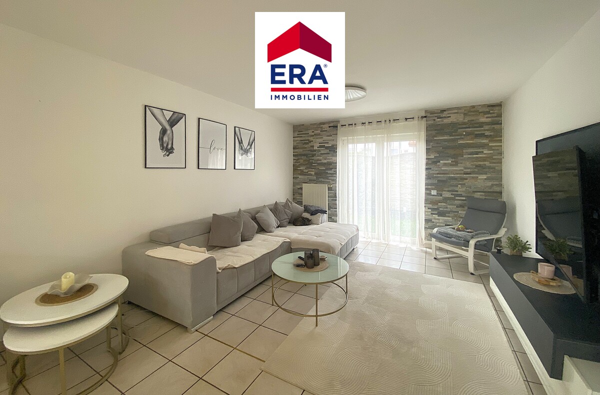 Über den großzügigen Eingangsbereich erreichen Sie den hellen Wohn-, Essbereich mit Zugang zur Terrasse und kleinem Garten, die Küche von der Sie ebenfalls die Terrasse erreichen, ein Gäste WC mit Waschbecken und die Garage für einen PKW.