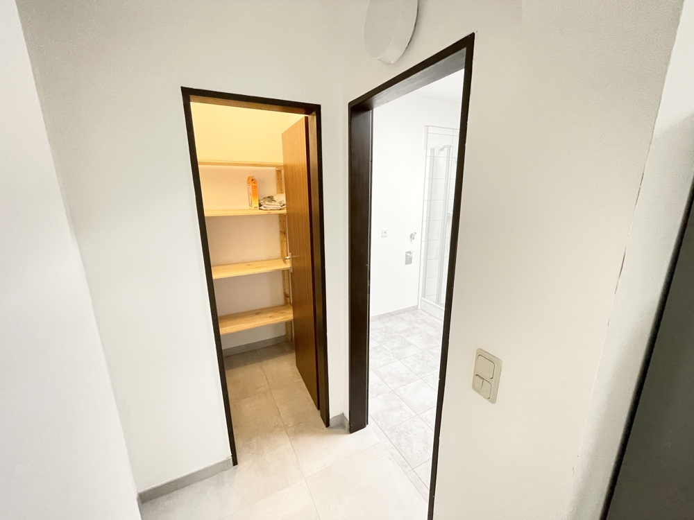 Auf ca. 51 m² Wohnfläche erwartet Sie ein großzügiger Wohn- und Schlafbereich mit offener Küche und Platz für einen Esstisch. Die moderne Einbauküche inklusive Elektrogeräten ist im Kaufpreis enthalten. Ein Badezimmer mit Dusche sowie eine separate Abstellkammer sorgen für zusätzlichen Komfort. Der Boden ist vollständig gefliest – pflegeleicht und sauber.