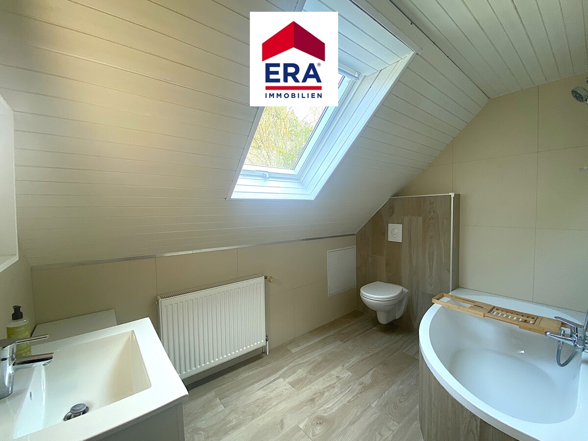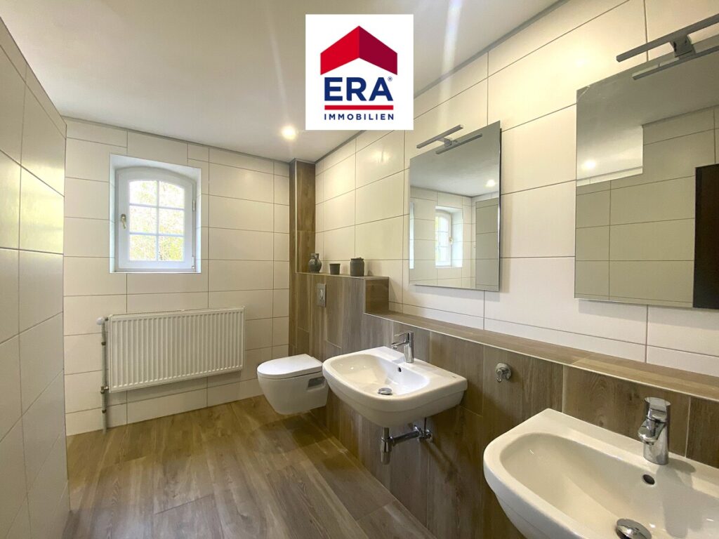 Des Weiteren finden Sie hier ein zeitentsprechendes Badezimmer mit Doppelwaschbecken, WC und großer, ebenerdiger Dusche, sowie ein weiteres Schlafzimmer/Büro.