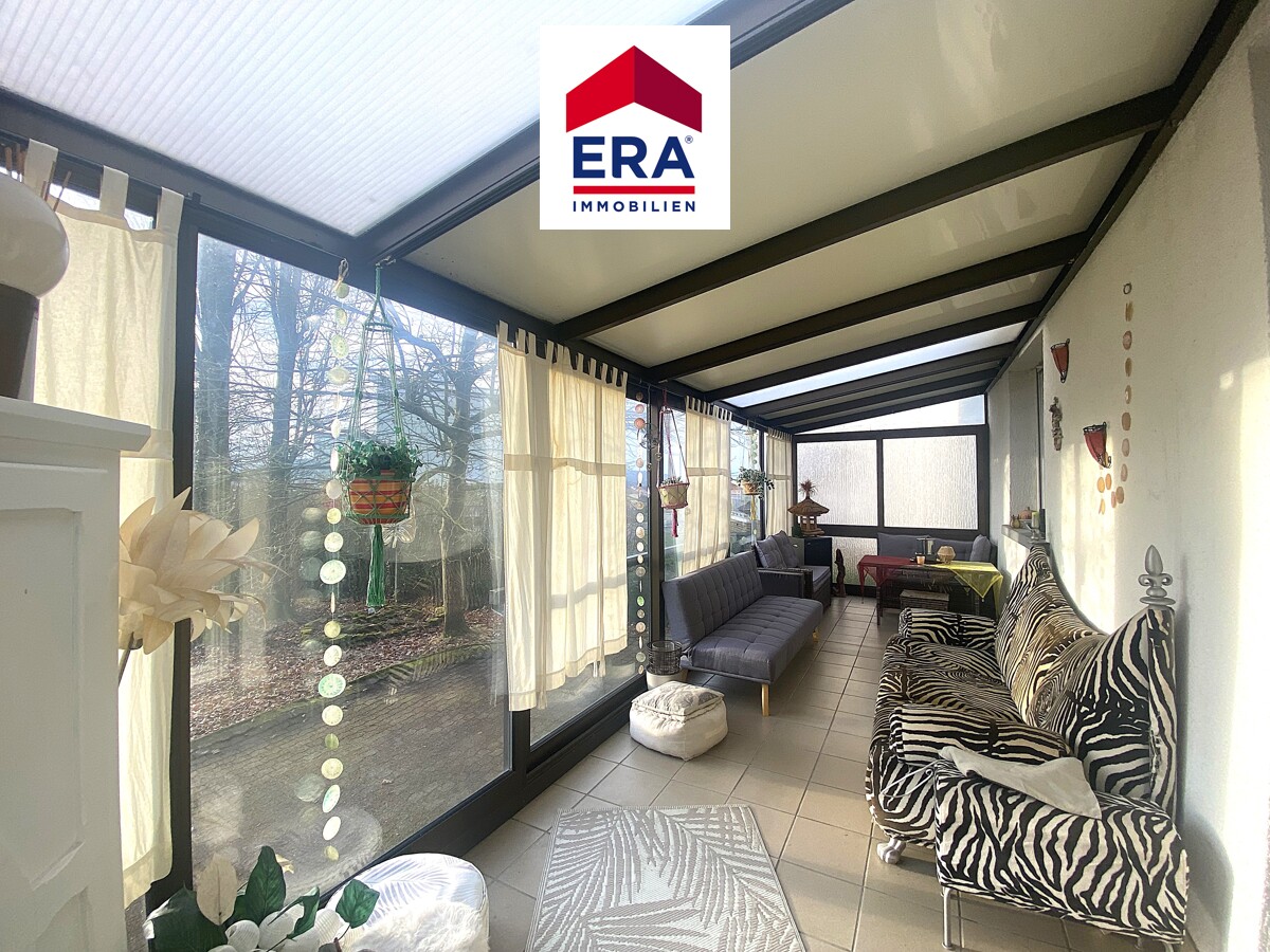 Über ein paar Außenstufen gelangen Sie zur Diele im EG mit Einbauschränken, hier befinden sich über 2 Ebenen, der helle Wohnbereich mit Kamin und der Zugang zum idyllischen Wintergarten mit Balkon und Markise. Des Weiteren finden Sie hier die Küche mit Sitztheke und Vorratskammer sowie das ansehnliche Esszimmer, ein exotisches Badezimmer mit Doppelwaschbecken und Wanne, ein separates WC mit Waschbecken, sowie 2 Schlafzimmer, eines davon mit Einbauschrank und eines mit Zugang zum Balkon mit Blick ins Grüne.