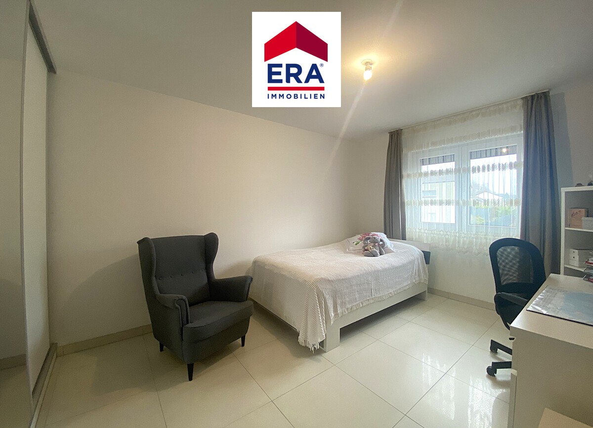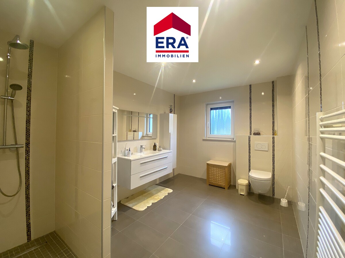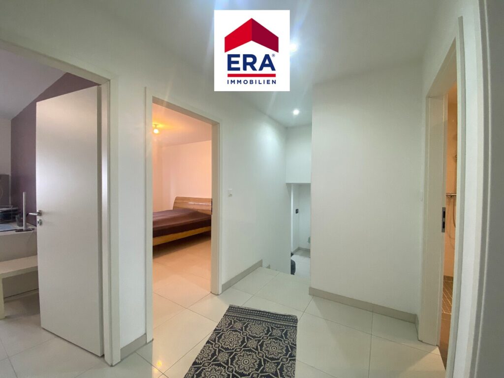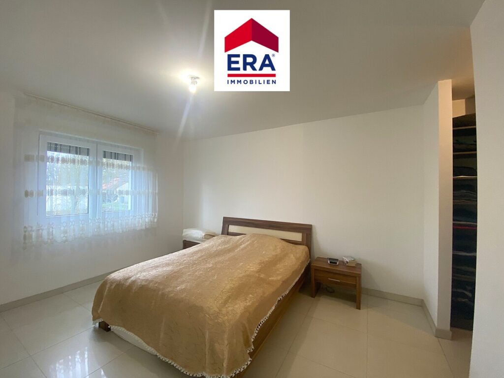 Nach einigen Stufen gelangen Sie zum OG, hier finden Sie 3 Schlafzimmer, eines mit eingebautem Schiebetüren-Spiegelschrank und eines mit begehbarer Ankleide. Das helle Badezimmer wurde ausgestattet mit ebenerdiger Dusche, Waschbecken, WC und elektr. Heizung, die Vorbereitung für eine Wanne ist vorhanden.