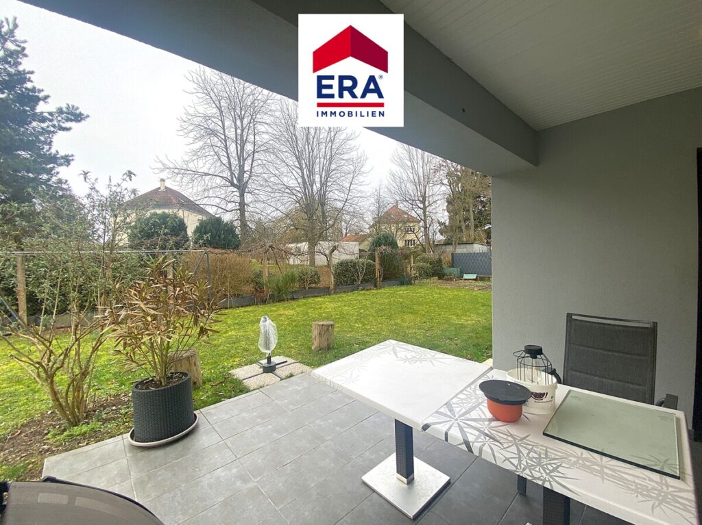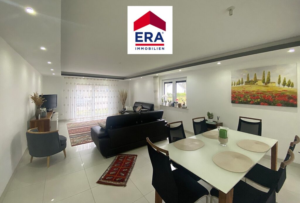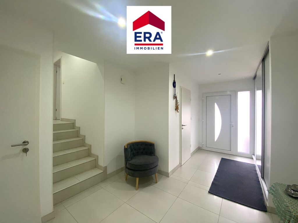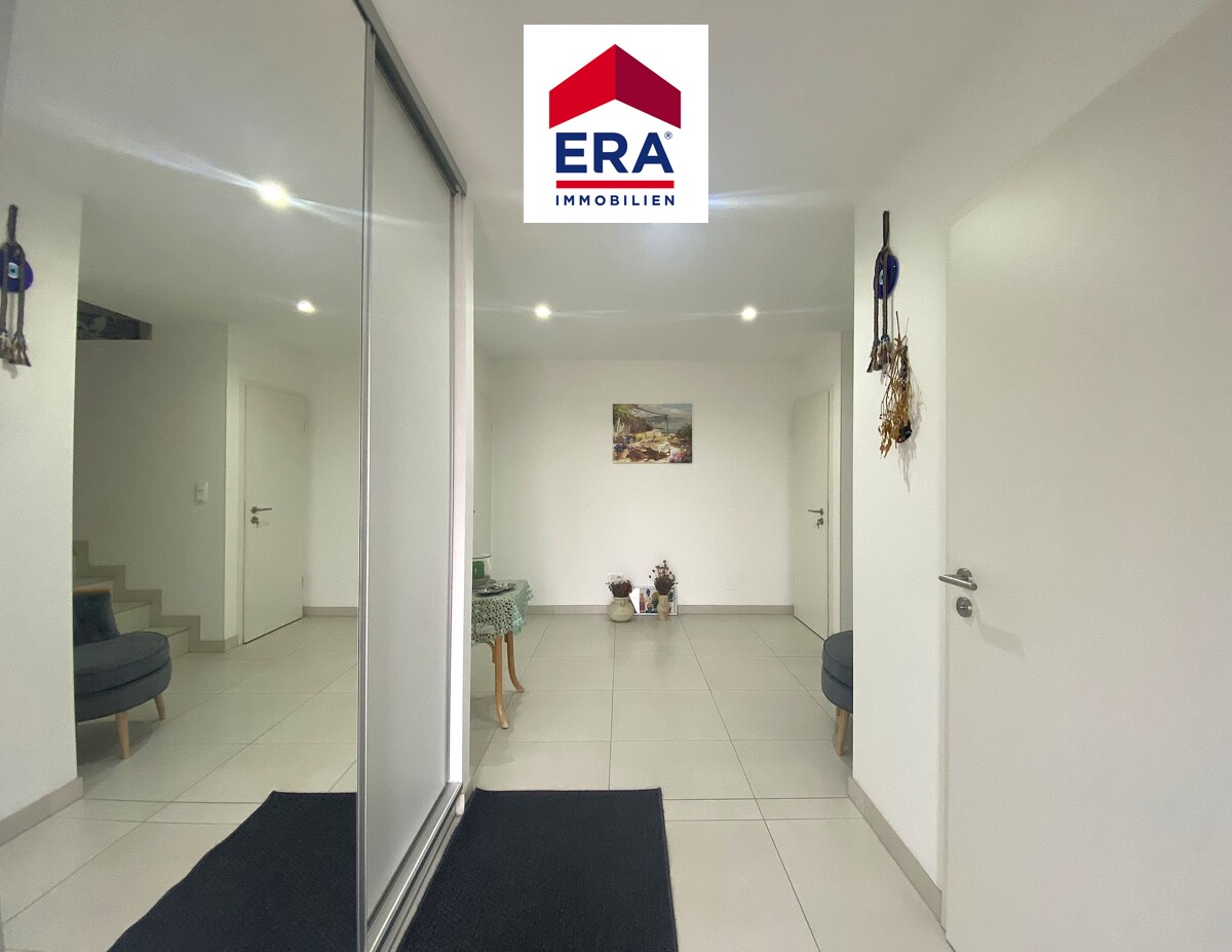 Über den Eingangsbereich mit großem Schiebetüren-Spiegelschrank und Gäste WC mit Waschbecken, erreichen Sie den lichtdurchfluteten Wohn-, Essbereich mit moderner Küche und Zugang zur Terrasse mit Garten.