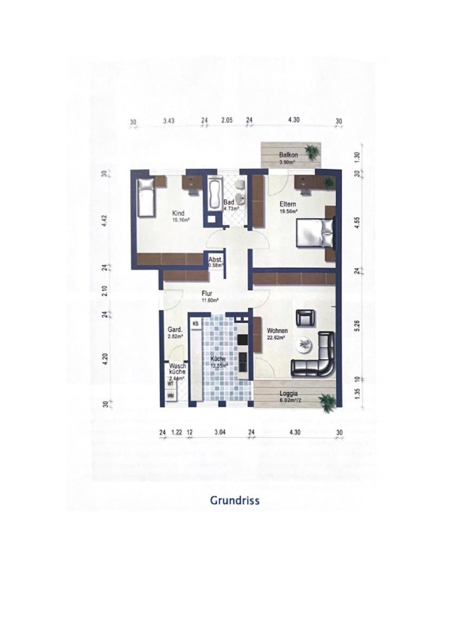 Diese drei Zimmer Wohnung befindet sich im dritten Stock eines gepflegten Mehrfamilienhauses. Wir betreten durch die Eingangstür den großen Flur mit Einbauschrank, Garderobe und Gästetoilette. Geradeaus geht es in das helle Wohnzimmer mit Zugang zur Loggia. Neben dem Wohnzimmer befindet sich die große Küche mit hochwertiger Einbauküche und Zugang zur Loggia. Links vom Flur geht es in den Privatbereich, hier befindet sich ein großes Schlafzimmer mit Zugang zum Balkon. Linker Hand ist ein helles Kinderzimmer.