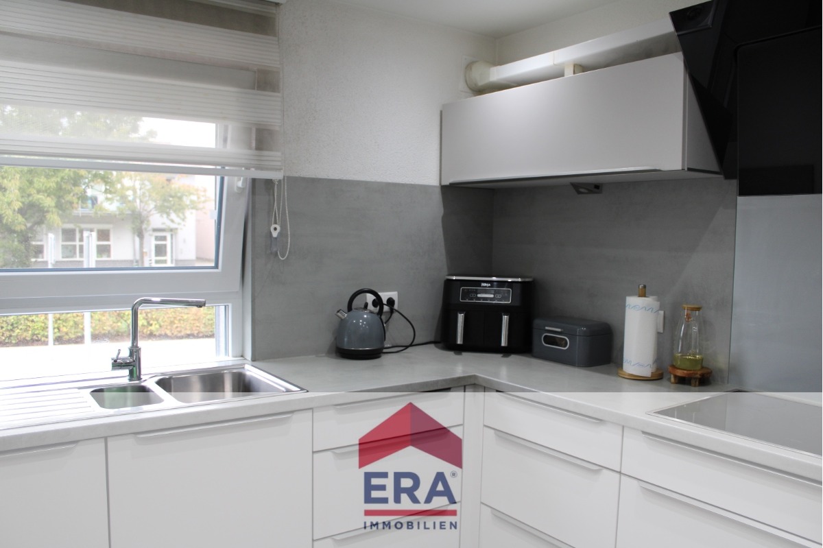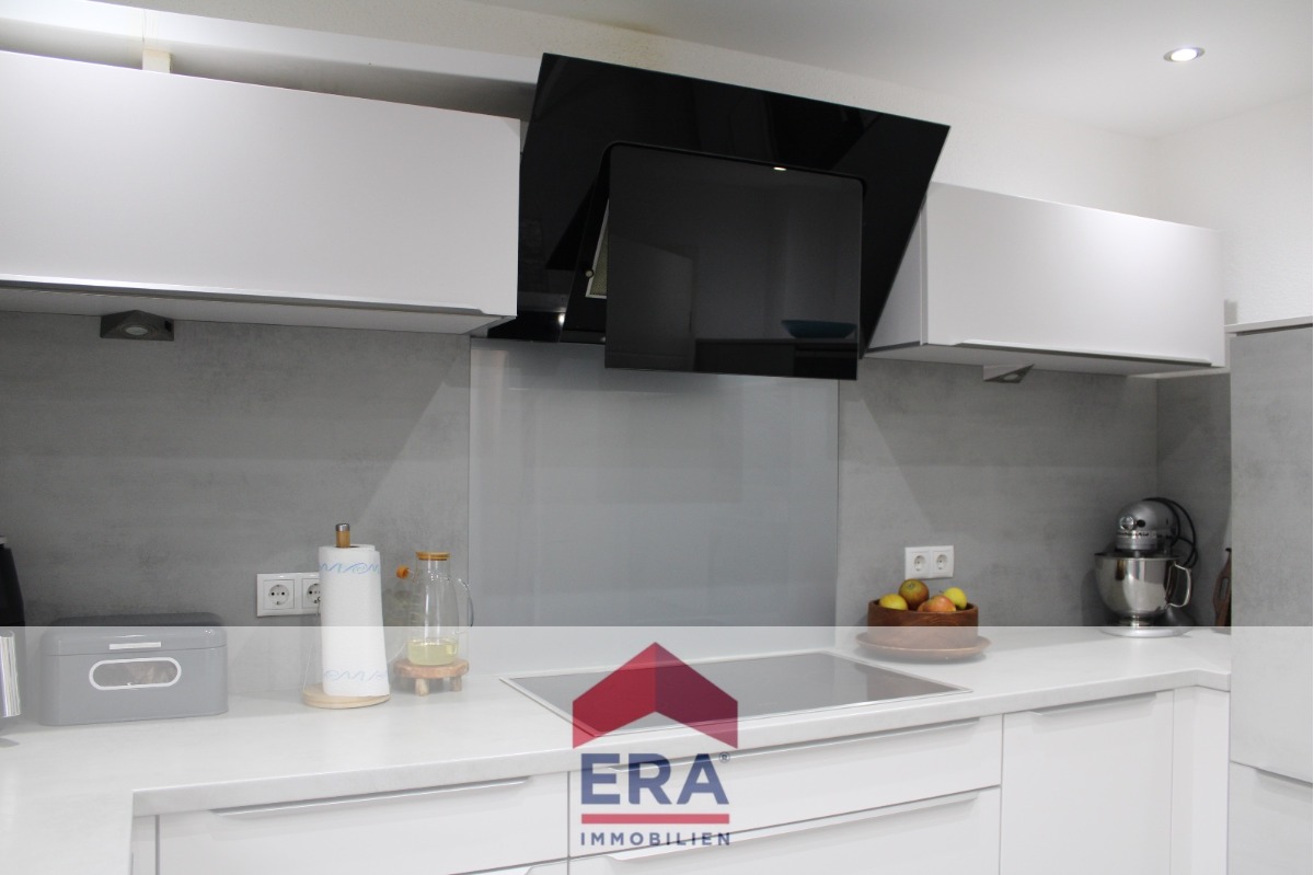 Direkt angrenzend liegt die moderne und hochwertig ausgestattete Küche, die durch ihr zeitloses Design überzeugt.