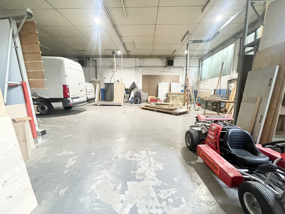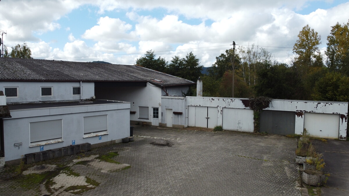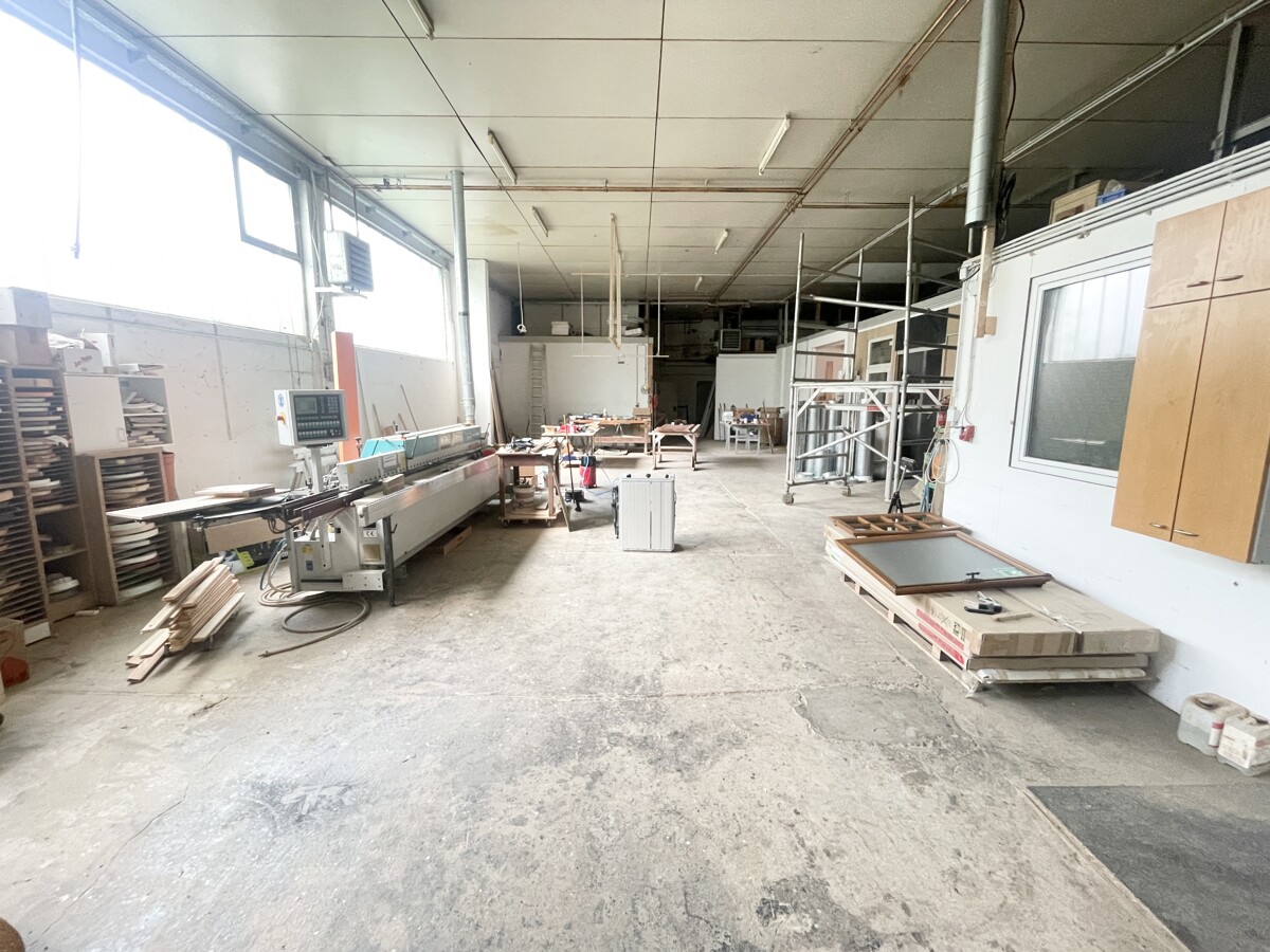 Die Hauptgewerbehalle verfügt über eine Fläche von ca. 580 m² und ist mit drei elektrischen Toren ausgestattet (zwei Tore mit je ca. 3 x 3 m sowie ein Tor mit ca. 2,50 x 2,50 m). Die Deckenhöhe beträgt ca. 4,60 m. Zusätzlich stehen ein Ausstellungsraum, zwei Büroräume und sanitäre Anlagen zur Verfügung. Starkstromanschluss ist vorhanden. Die Halle ist mit einer Ölheizung aus dem Jahr 2010 ausgestattet, ebenso wurden Elektrik und Wasserleitungen zu diesem Zeitpunkt erneuert. Eine Absauganlage für staubintensive Arbeiten, z. B. im Bereich Holzverarbeitung, ist ebenfalls vorhanden.